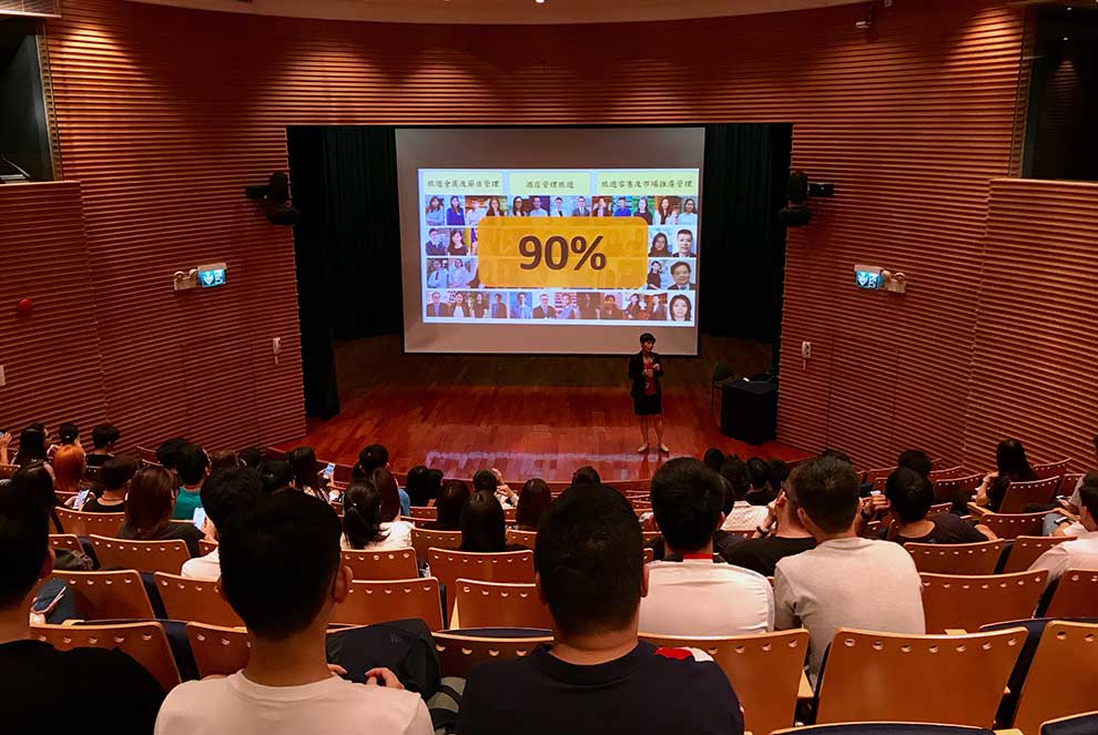 是次講座於8月20日假學院氹仔校區展望樓大禮堂舉行,由夜間學位課程主任林靜芝博士主持。她首先向新生介紹夜間學位課程的微信公眾號,讓學生能夠隨時緊貼學院的最近資訊。接著她闡述未來四年的課程內容,包括課程實習撮要,亦講解文憑及學士學位課程之別,以及簡介夜間部學生會。為讓新生熟悉校園,林靜芝博士也介紹了校園各項設施服務,包括校內餐廳、圖書館、學生輔導主任和各行政部門。