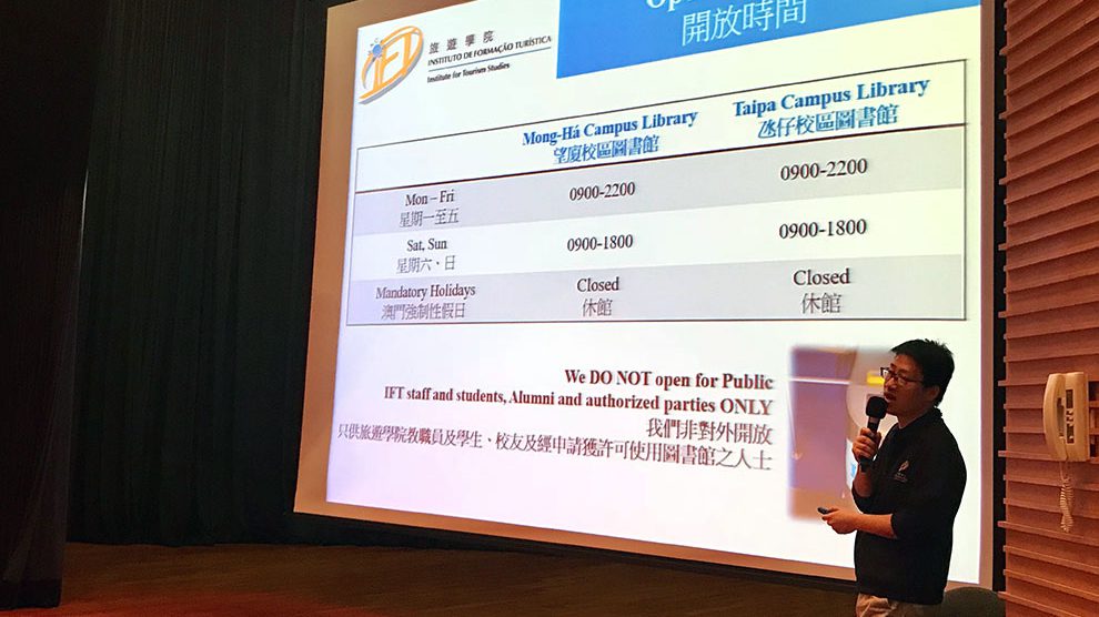 隨後,旅遊學院圖書館代表也向新生簡述圖書館的基本資訊,包括開放時間、相關書籍期刊、多媒體資料、數據庫及借書細則等,並鼓勵學生善用圖書館的豐富資源,有助他們撰寫功課報告。在講座結束後,學生分成不同科系進行註冊及選科,並在技術暨學術輔助部人員的帶領下參觀校園。