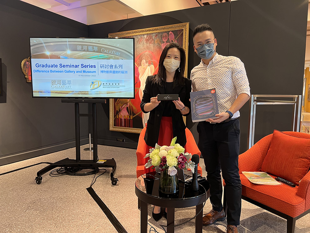 The docents were followed by seminars, moderated by Ms. Florence Lam, the manager of GalaxyArt, and Ms. Catherine Lam, the operational manager of GalaxyArt. The seminar on 15 November was about the differences between a gallery and a museum. According to the speaker, the differences between a gallery and a museum are mainly about the aims, collection, exhibition duration, funding source, and target audience.  As part of the seminar, Ms. Florence Lam mentioned that GalaxyArt focuses more on raising awareness of arts and culture in society, and provides educational docents for the students in Macao.