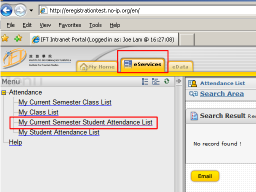 | Step 3 | - After successfully login, Click "eServices" then choose "My Current Semester Student Attendance List" |