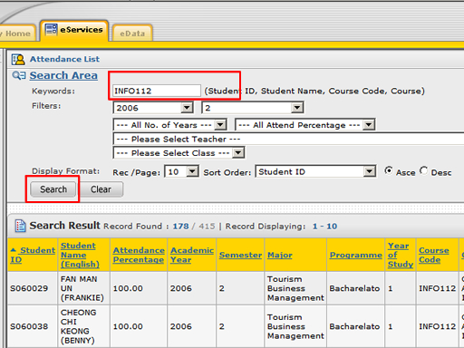 | Step 4 | - if you are teaching more than one class, you can filter the student through "Search Area" then click "Search" |