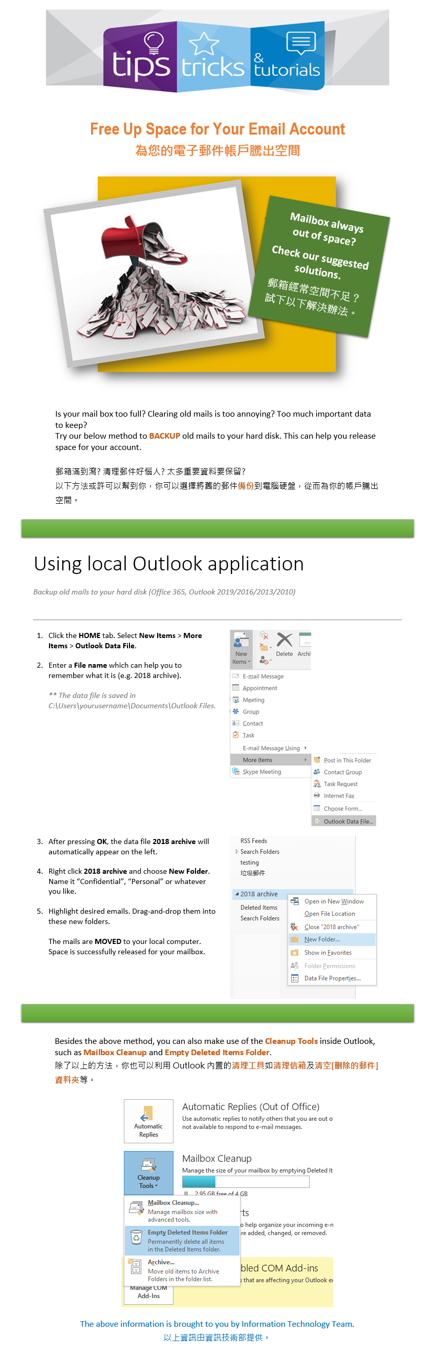 Academic and administrative information will be sent to students' email accounts. To ensure that the mailbox storage capacity does not exceed the upper limit, users should check and organize their accounts regularly to ensure that they do not miss any important messages. They should also delete emails regularly or save important emails to their personal computers. In addition, to protect users' personal data, UTM strongly recommends that students and staff use UTM Email to communicate with UTM to protect their privacy and data.
