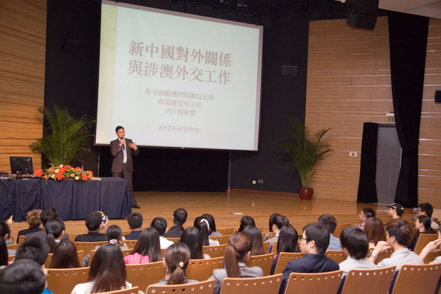 為進一步讓學生瞭解國家的外交政策和國際關係,學院邀請外交部駐澳門特派員公署政策研究室尹巨明主任與學生分享「國家外交與涉澳外交工作」,講座於大禮堂舉行,逾100名學院師生員工出席講座。 |