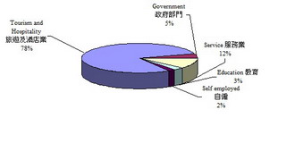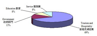 For diploma graduates, the overall response rate was 39.5%. According to the results of the survey, 86.7% of the respondents were employed. They all had full-time employment with a monthly median salary range of MOP19,000. The employment sectors are displayed in the figure below.