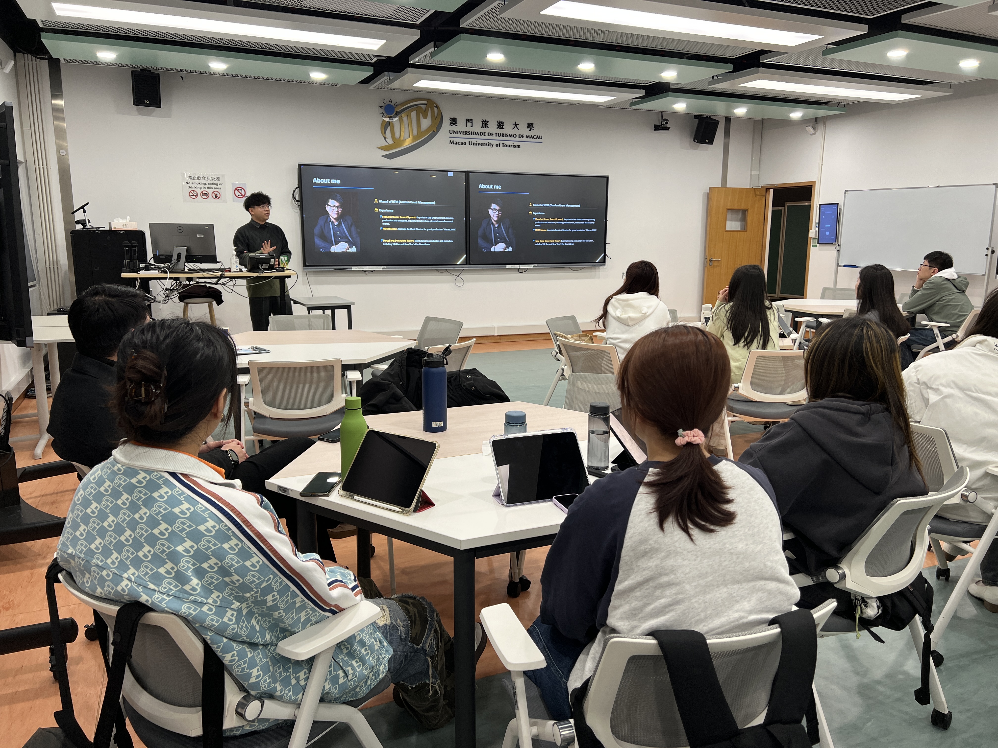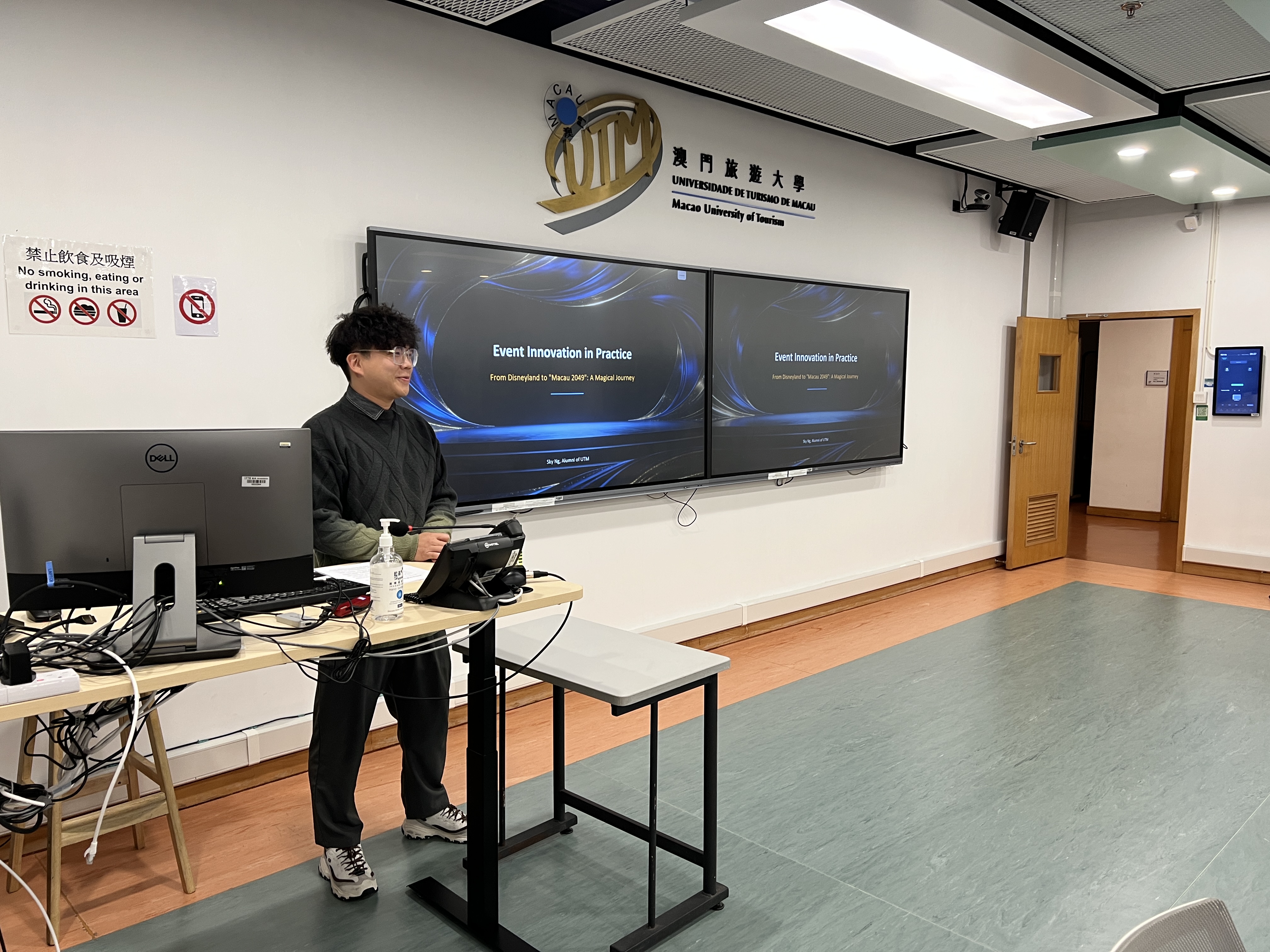 國際會展及盛事管理理學碩士學位課程的學生們透過客座講師吳朝暉先生(Sky)的分享,深入瞭解活動創新的實務應用。身為澳門旅遊大學旅遊會展及節目管理理學士學位課程的校友,Sky於奧蘭多、上海及香港迪士尼樂園展開環球奇幻的職業生涯。近期重返家鄉澳門服務蓬勃發展的會展業,他參與了由中國傳奇導演張藝謀執導、廣受好評的《澳門2049》演出。專精於舞台管理與節目製作的Sky,憑藉其在演藝圈的豐富資歷與深厚背景,以獨到的活動創新觀點深深吸引在場學生。