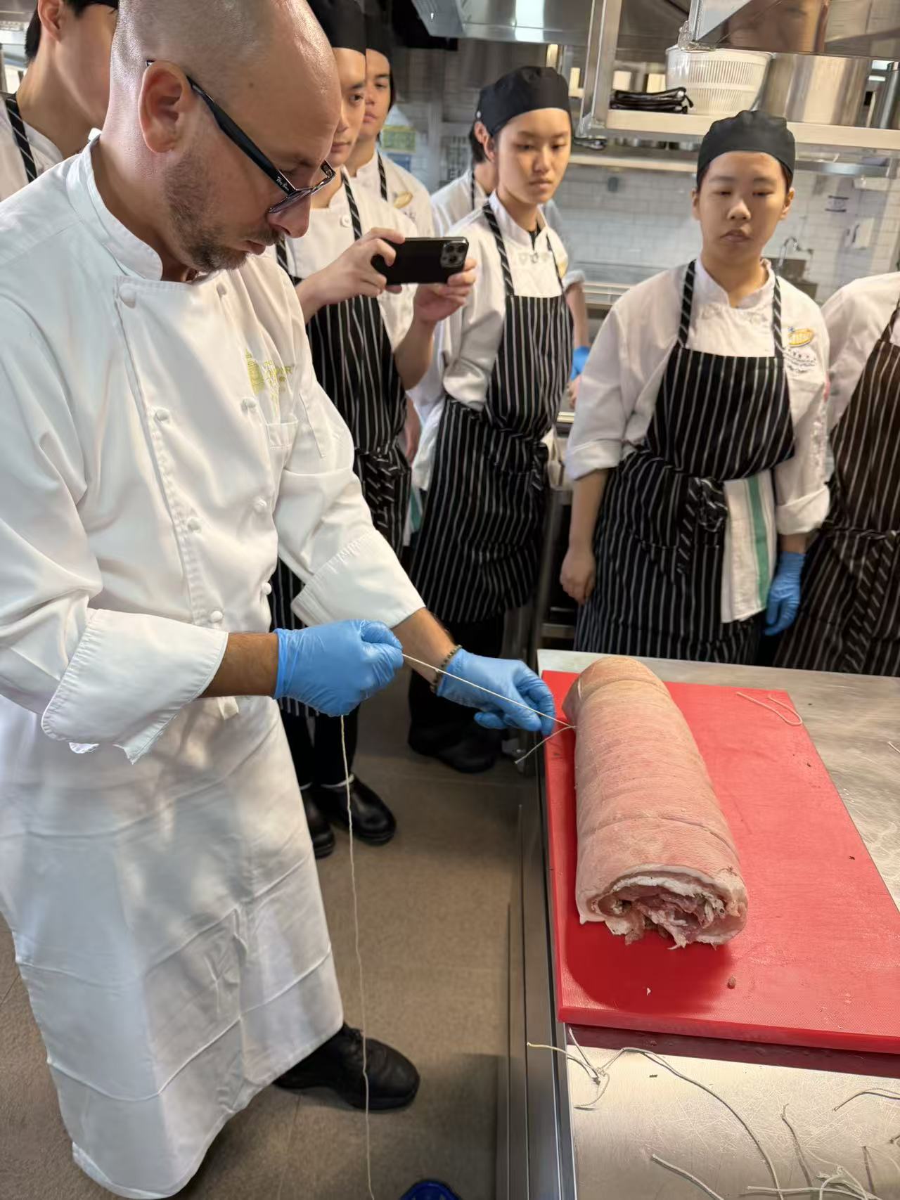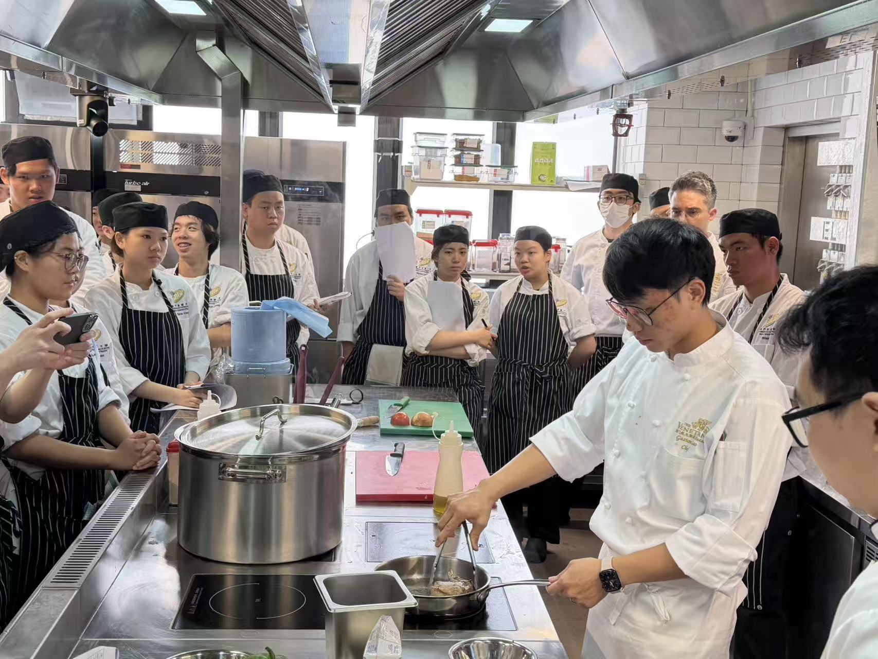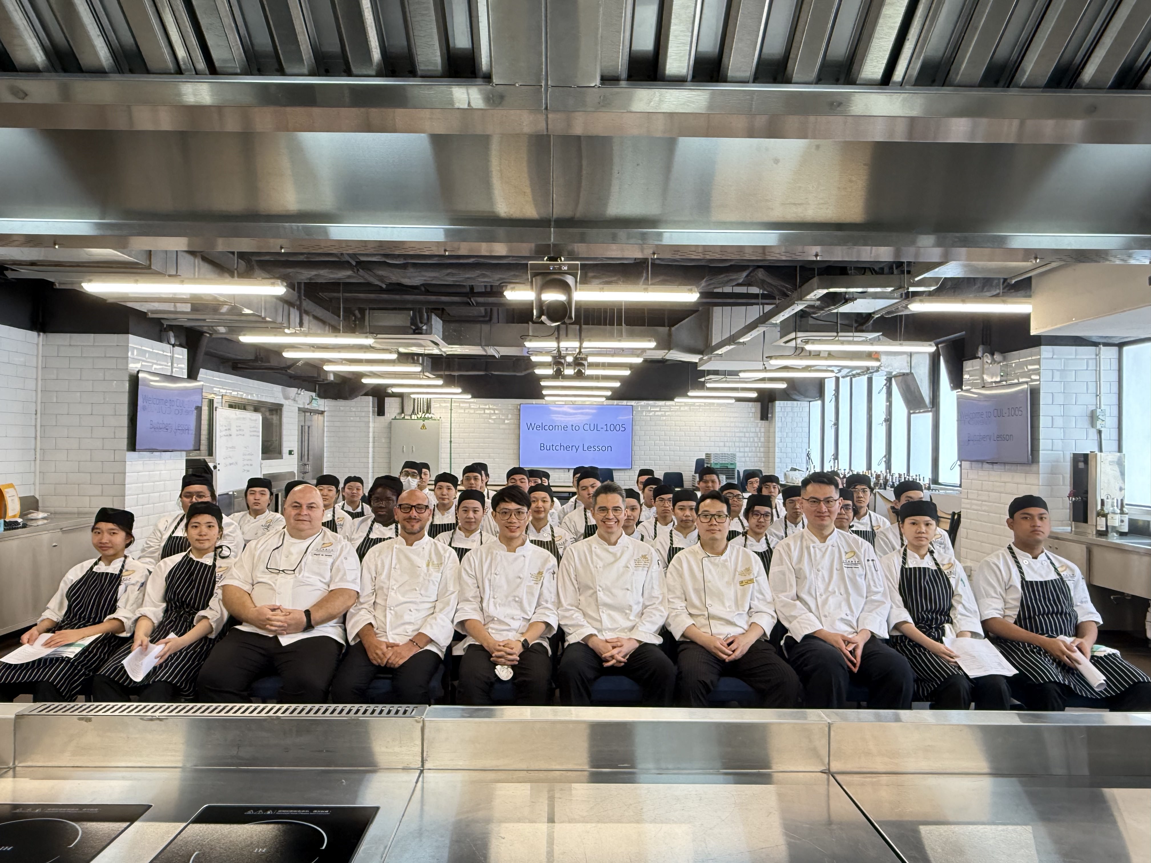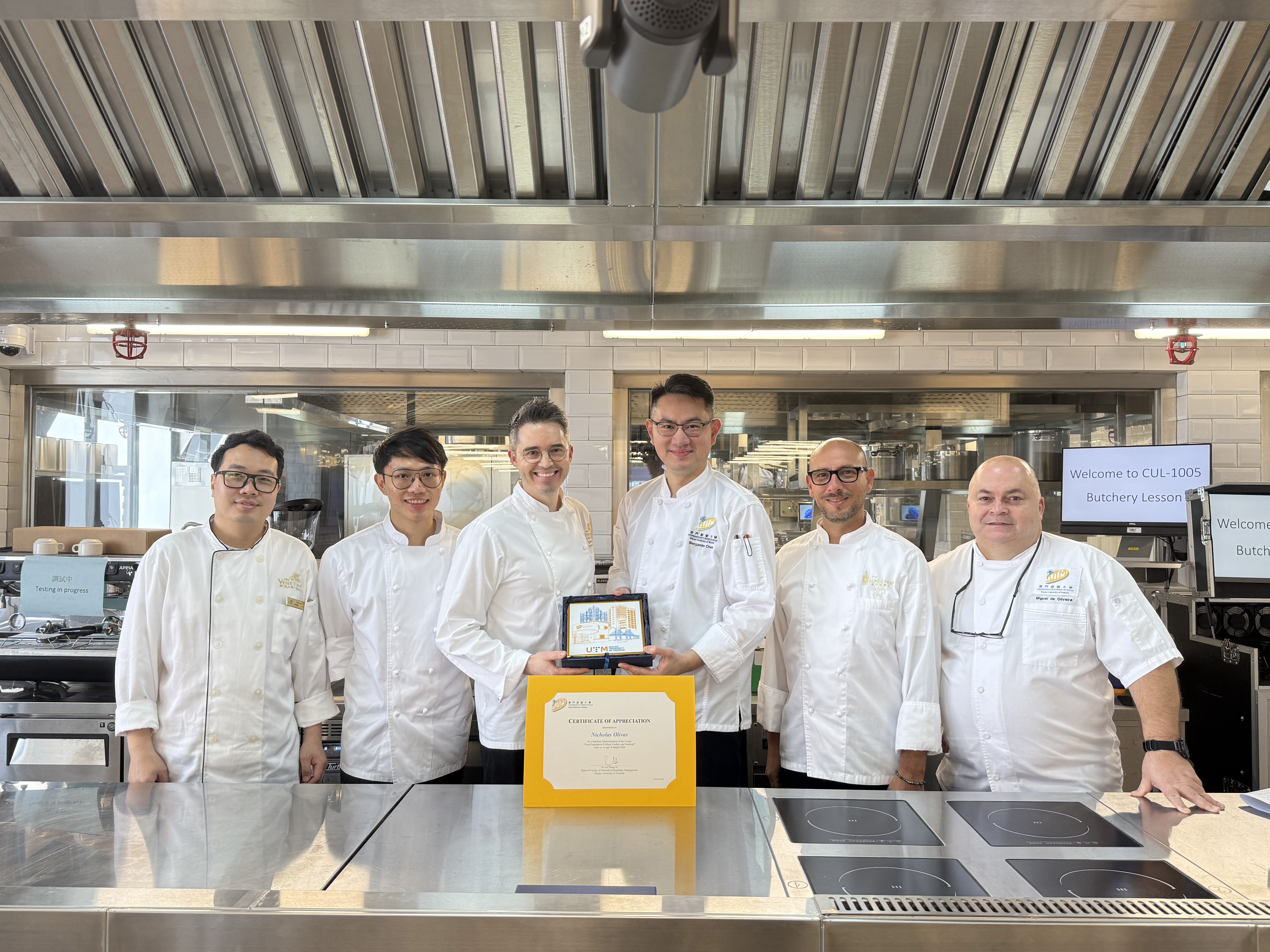 2026年3月16日及18日,我們榮幸邀請到澳門金沙酒店的專業廚師團隊,為本學期帶來標準化的廚藝示範教學。在名廚 Stefano Novello、Nicholas Olivas、劉啟豪與 黎漢森的逐步指導下,學生們學習了從人道屠宰到肉類精準切割與分切的完整流程。廚師們亦示範了各類肉品的正確處理技巧,並傳授關鍵的實務要點,協助學生將理論知識轉化為實際操作能力,為未來的專業工作奠定扎實基礎。