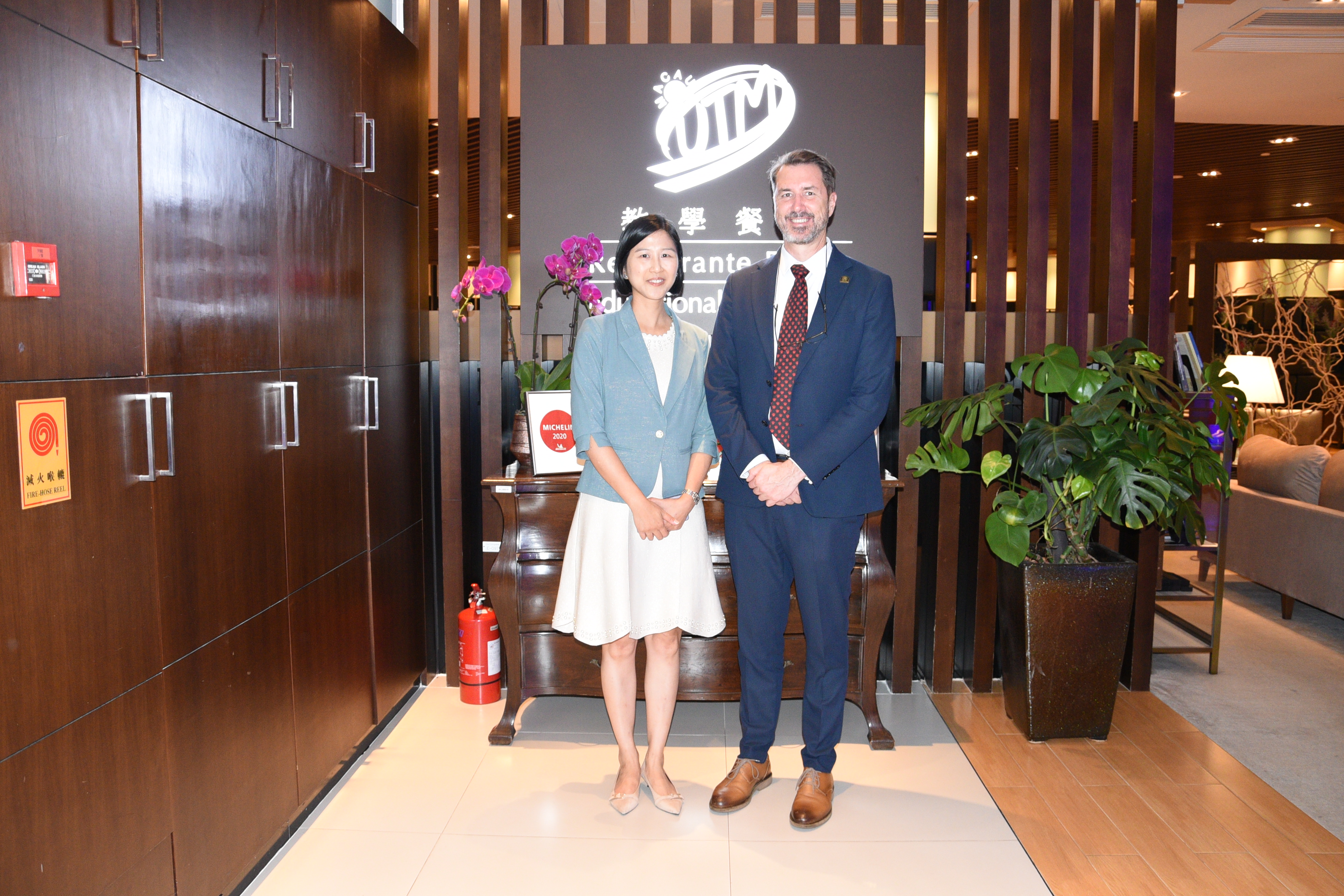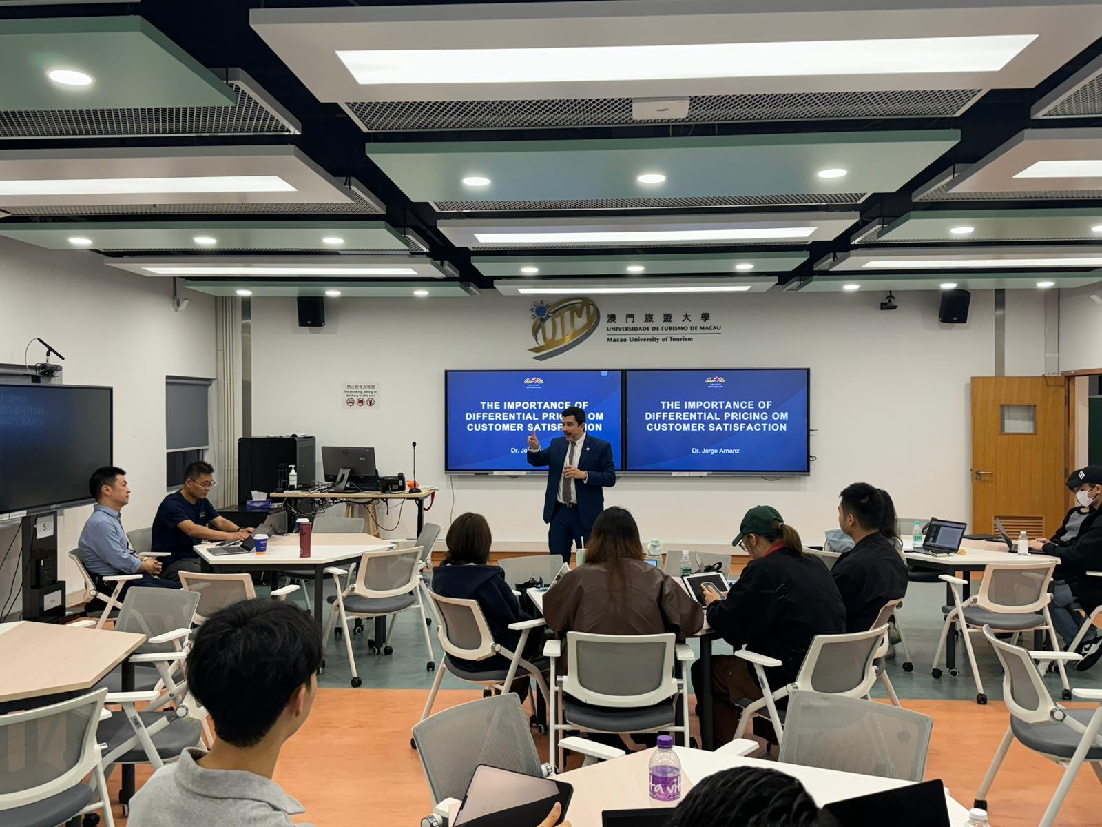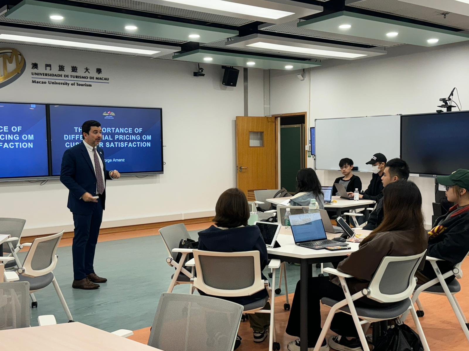另外,瑞士代表團參觀了澳門旅遊大學望廈校區的各個設施,瞭解到澳旅大最先進的培訓設施以及本校對可持續發展的承諾。澳門旅遊大學教學餐廳總監 Hans Rasmussen 先生亦會見了代表團,並介紹了澳旅大在餐飲部門堅持不懈的努力。望廈迎賓館的 阮菊美女士亦為瑞士代表團提供了導覽服務。此外,Jorge Arnanz 博士還為碩士課程的學生們進行了一場題爲“差異定價對顧客滿意度的重要性”的講座。