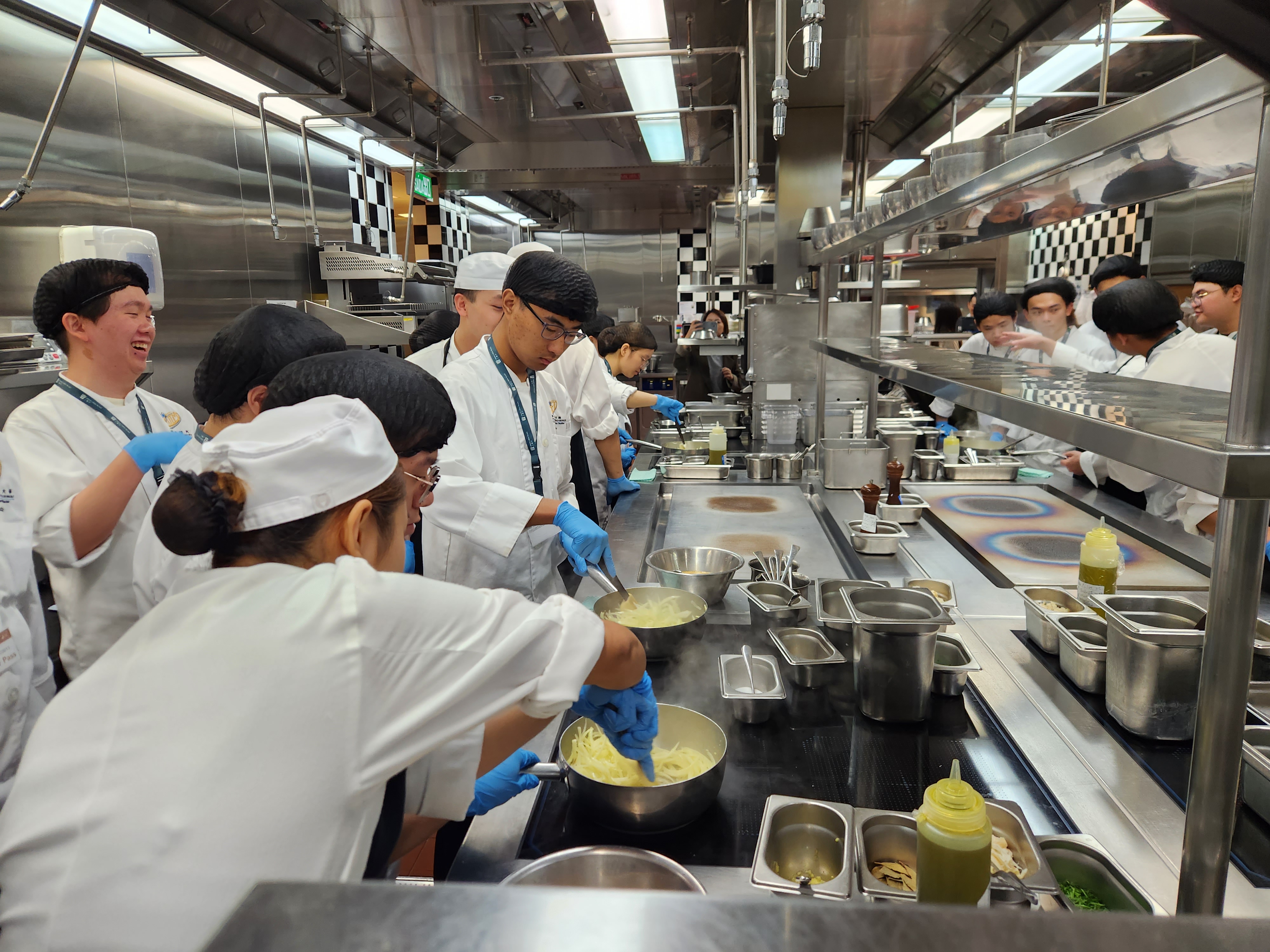 講座結束後,學生由專人帶領參觀了後廚區域,例如西點廚房、中央廚房(冷廚和熱廚)以及員工餐廳的後勤區(餐具清潔間/儲藏室)。這次深度參觀讓學生深入了解高效大規模餐飲運營的精準流程與團隊精神,令人受益匪淺。